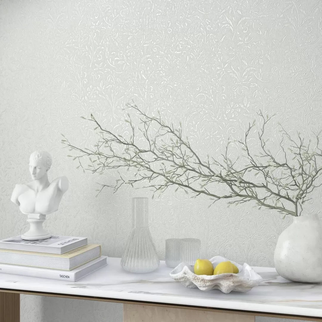 Give your walls a touch of vintage romance: this wallpaper combines a delicate floral relief with elegant gold accents on a patinated background. Ideal for stylish interior design with classical elegance and artistic character.